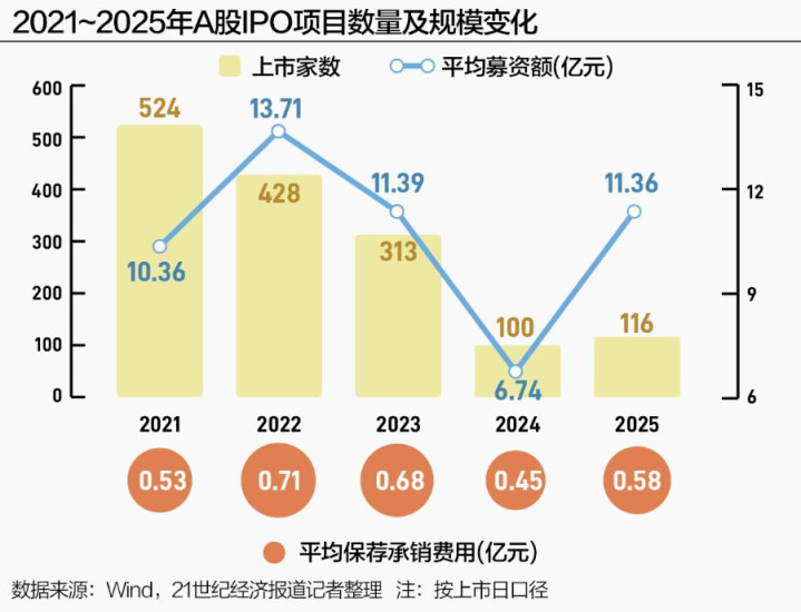 2025年过去,一些新的信号开始显现。IPO上市公司数量小幅回升至116家,更重要的是,平均募资额显著恢复至11.36亿元,与之对应,券商的平均保荐承销费用也回升至0.58亿元。